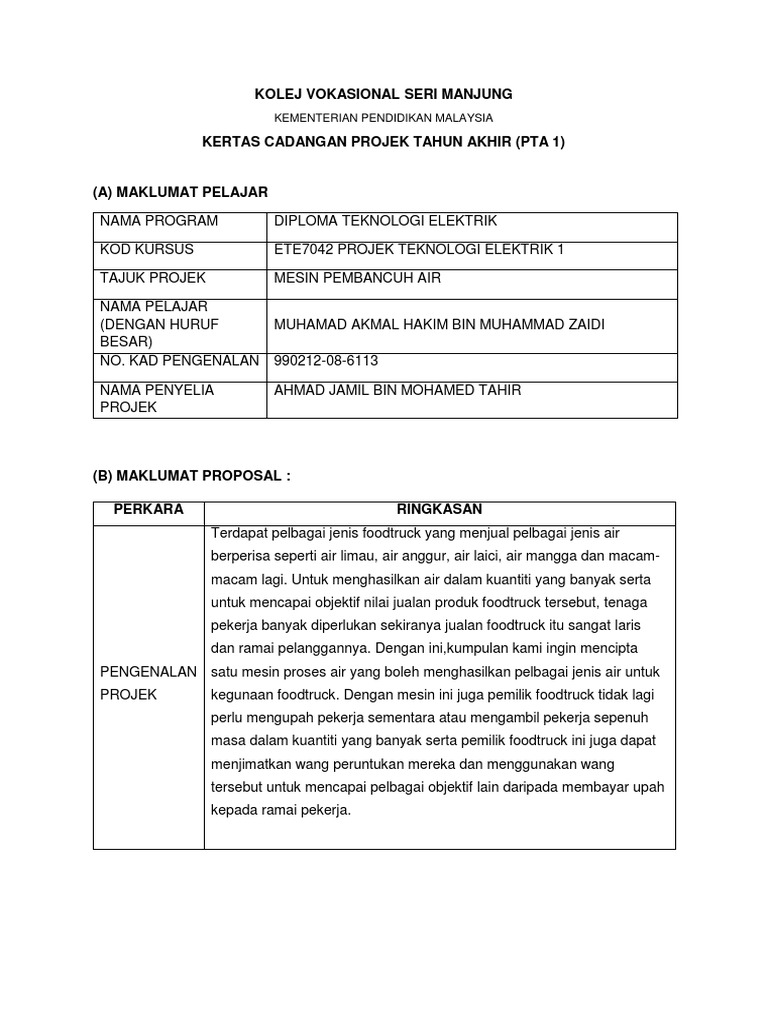 Contoh Projek Tahun Akhir Kolej Vokasional Seni Kulinari
